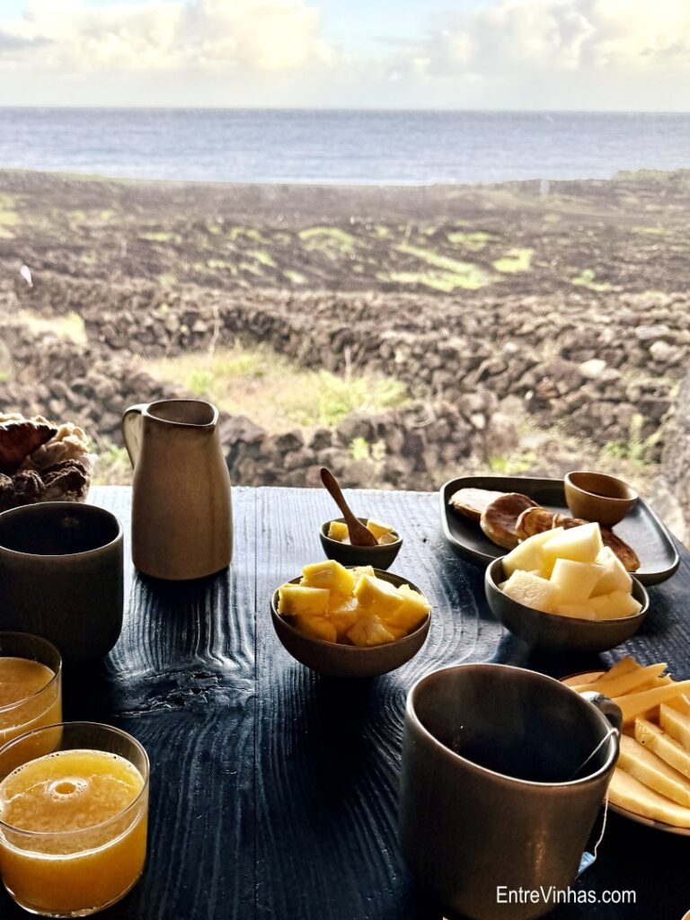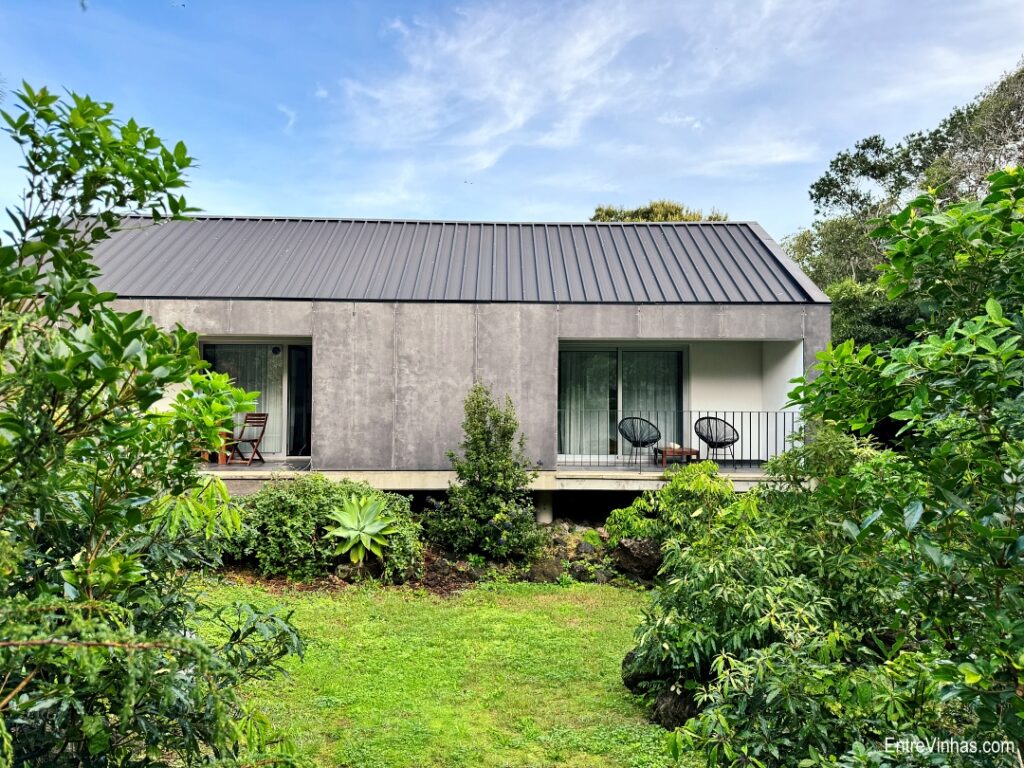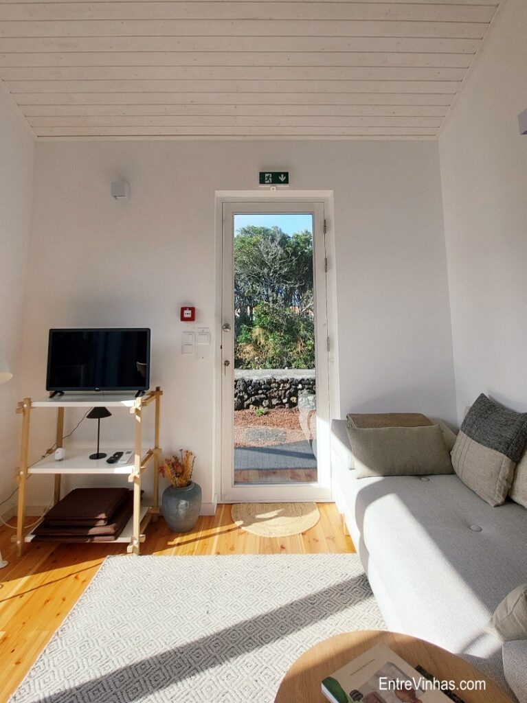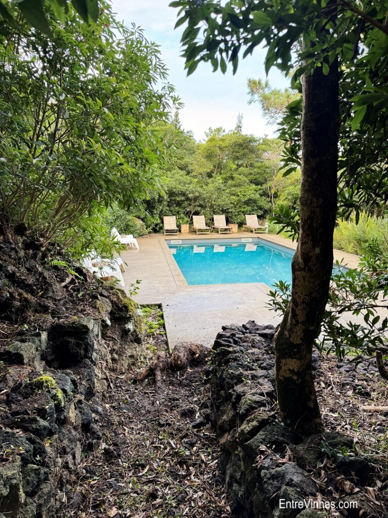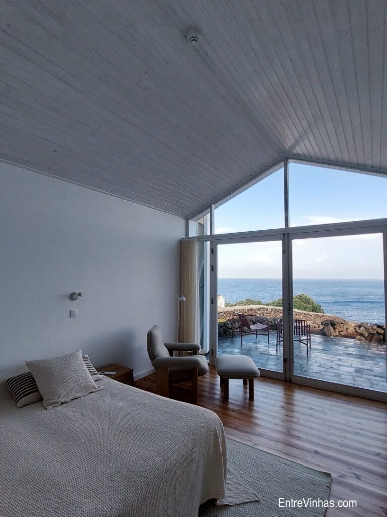 A propriedade dispõe de cinco suítes, cada uma com kitchenette e varanda que dá acesso direto aos “currais” de pedra, onde crescem as castas típicas: Arinto dos Açores, Verdelho e Terrantez do Pico.