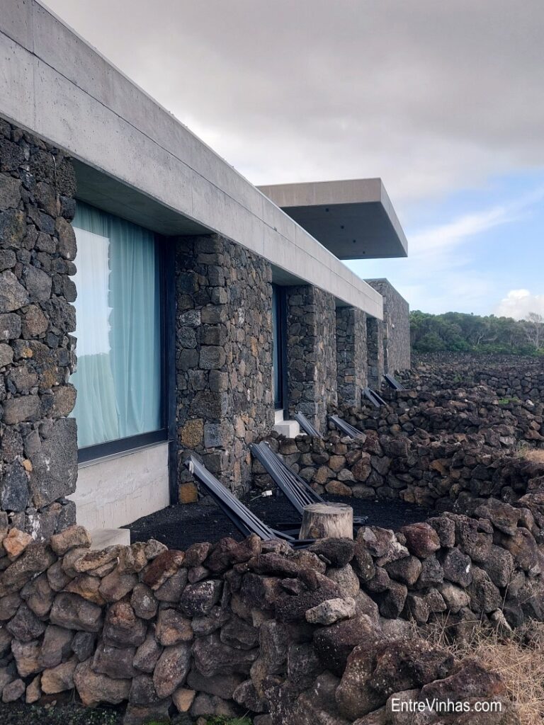 O edifício, projetado para respeitar as normas da UNESCO, integra-se harmoniosamente na paisagem de basalto da ilha, com vistas para a montanha do Pico.