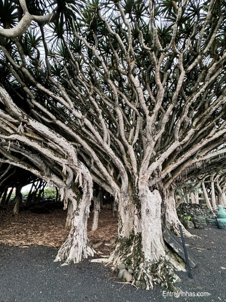 Mas o que me encantou mesmo foi o exterior: um pequeno pavilhão de madeira pintada do típico encarnado por cima das vinhas nos seus currais e ao lado do jardim de impressionantes dragoeiros centenários.