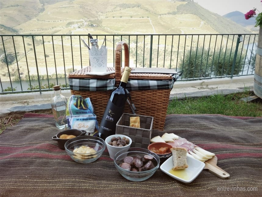 A equipa de enoturismo prepara um cesto de verga recheado com coisas deliciosas: tábua de queijos e enchidos, azeitonas e o seu azeite, chouriços e marmelada, rissóis de camarão e pataniscas de bacalhau, bola de carnes e pãozinho caseiro, além do vinho claro! E tudo isto, no relvado com vista privilegiada para o Douro.