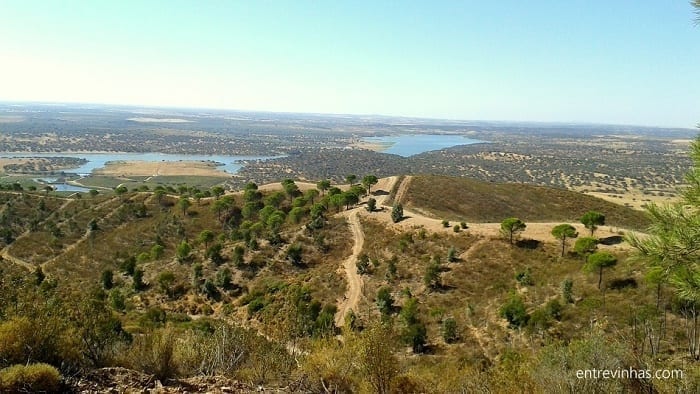 Desde o cimo da serra do Mendro vê-se toda a propriedade, desde a casa e a piscina, aos 52ha de vinha desenhados com régua e esquadro, ao rio Guadiana, ao pomar e olival até Beja lá ao fundo, bem visivel em dias de céu limpo.