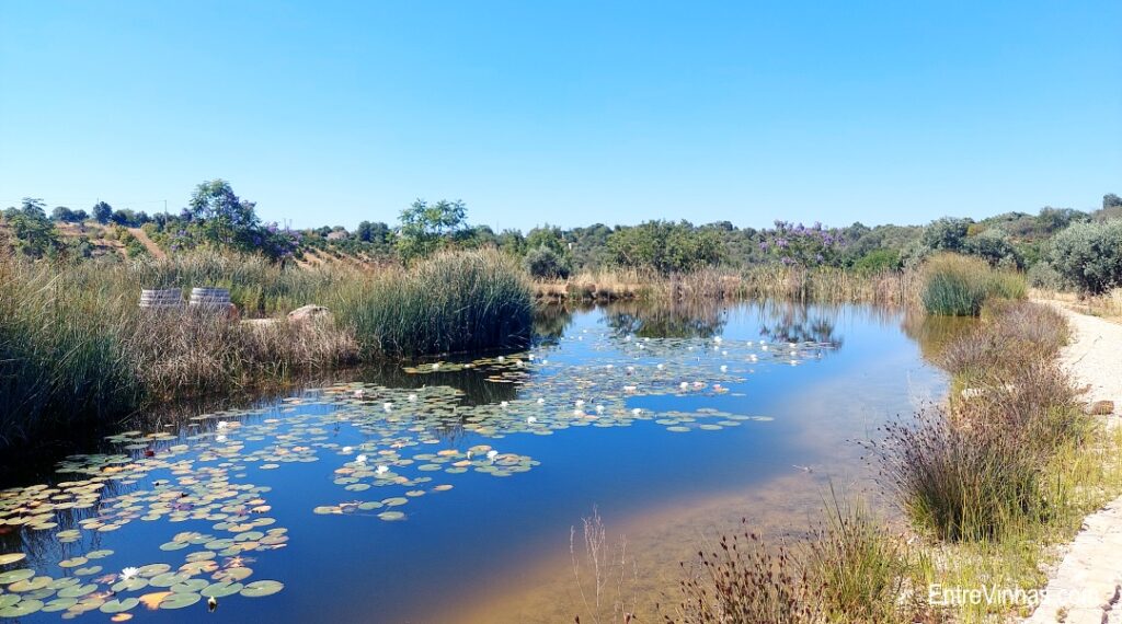 Esta foi uma das formas encontradas para promover uma maior biodiversidade na quinta. É impossível ignorar o coaxar dos sapos que habitam a charca, assim como a quantidade de borboletas que voam por ali.